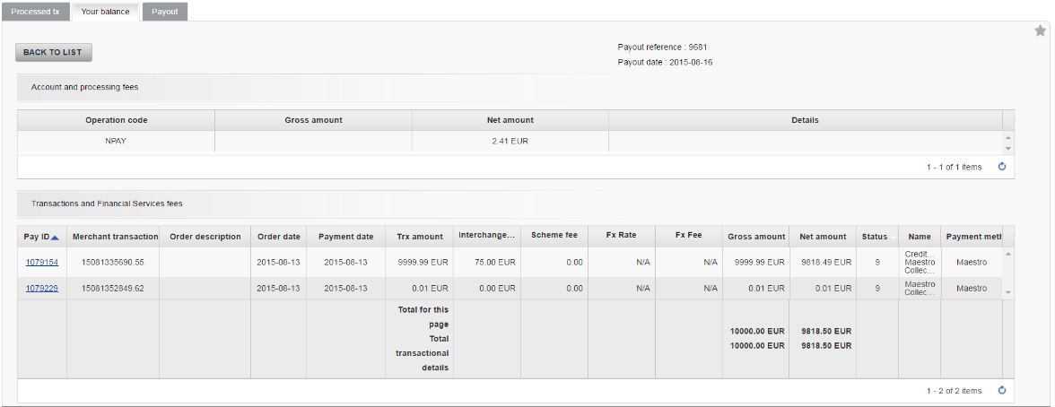 By clicking on the button “Details”, you can check all "Account and processing fees" and "Transaction and financial services" details which are associated to the selected payout.